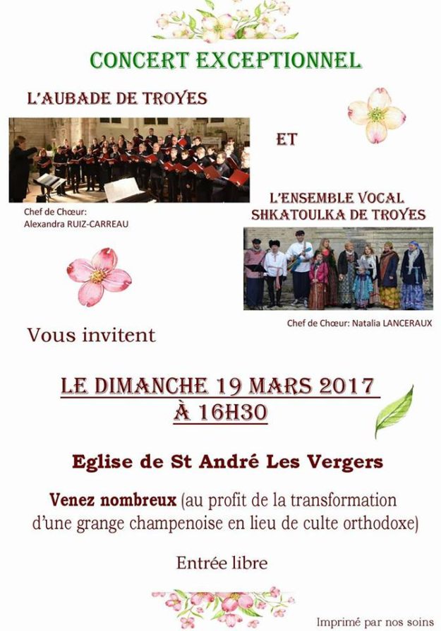 Ce concert a été donné par la chorale « l’Aubade » et « l’Ensemble Shkatoulka » au profit de la restauration et de la transformation d’une grange champenoise en lieu de culte pour les chrétiens orthodoxes de Troyes. Un peu d’histoire L’Église Orthodoxe de Troyes. La ville de Troyes est un endroit « béni de Dieu ». C’est un…