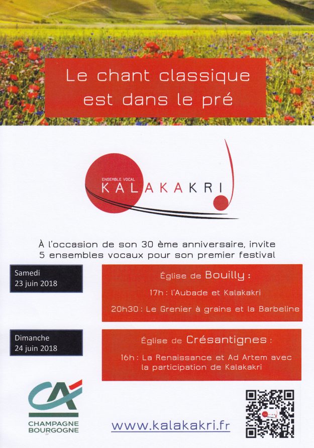 Ce qu’en a dit la presse Les vidéos du festival extraites du DVD. Samedi 23 juin 2018 à l’église de Bouilly Ensemble vocal Kalakakri L’Aubade de Troyes Chorale « Le grenier à grain » Ensemble vocal La Barbéline Dimanche 24 juin 2018 à l’église de Crésantignes…