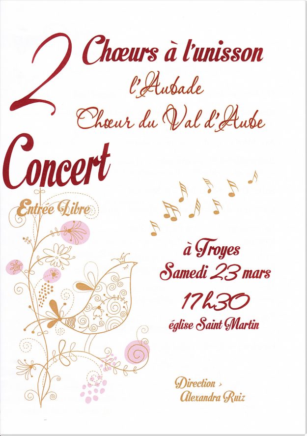 Le programme du concert Ce qu’en dit la presse Les vidéos du concert l’Aubade Chœur du Val d’Aube Chœurs à l’unisson