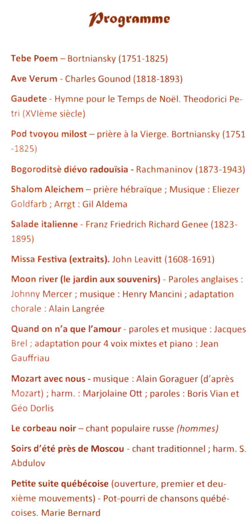 L’affiche du concert Le feuillet et le programme du concert L'église, l'installation et la mise en voix Les vidéos du concert Tebe Poem (Bortniansky) Ave Verum (Charles Gounot) Ave Verum (Charles Gounot) Gaudete; Hymne pour le temps de Noël (Théodorici Petri) Gaudete; Hymne pour le temps de Noël (Théodorici Petri) Pod tvoyou milost Prière à la Vierge (Bortniansky) Pod tvoyou milost Prière à la Vierge (Bortniansky) Bogoroditsè dievo radouïsa (Rachmaninov) Bogoroditsè dievo radouïsa (Rachmaninov) Shalom Aleichem ( Prière hébraïque du vendredi soir) Shalom Aleichem ( Prière hébraïque du vendredi soir) Salade italienne (Frantz Friedrich Richard Genee) Salade italienne (Frantz Friedrich Richard Genee) Missa Festiva : extraits. (John Leavitt) Missa Festiva : extraits. (John Leavitt) Missa Festiva : extraits. (John Leavitt) Moon River "le jardin aux souvenirs" (Johnny Mercer et Henry Mancini) Moon River "le jardin aux souvenirs" (Johnny Mercer et Henry Mancini) Rock my Soul (Pierre-Gérard Verny) Rock my Soul (Pierre-Gérard Verny) Canon des Scats (Pierre-Gérard Verny) Canon des Scats (Pierre-Gérard Verny) Quand on a que l'amour (Jacques Brel) Quand on a que l'amour (Jacques Brel) Mozart avec nous ( W.A. Mozart, Boris Vian, Géo Dorlis et A. Goraguer) Le Corbeau noir (Chant populaire russe - 4 voix d'hommes) Soirs d'été près de Moscou - Chant traditionnel (ham. S. Abdulov) Tout va très bien, madame la Marquise ... Tout va très bien, madame la Marquise ... Catégorie ConcertPar Arnaud de Charrin17 avril 2017Laisser un commentaire Auteur Arnaud de Charrin Navigation de commentaireOnglet précédent Onglet précédent Concert à Saint André les Vergers le 19 mars 2017Onglet suivantOnglet suivantConcert dans l’église de Luyères le 08 juillet 2017Related postsAnimation Chez « Tendance Fermière » le 14 décembre 202420 janvier 2025Concert à Vaudes le 18 juin 202329 juillet 2023Concert donné à Frangy (74) le 13 mai 202328 juillet 2023Concert à Chauffour lès Bailly le 16 octobre 202213 janvier 2023Concert du Territoire « A Cœur Joie » Champagne Ardenne le 14 mai 202230 septembre 2022Concert du 8 mai 2022 en l’église Saint Pierre d’Isle-Aumont26 juillet 2022